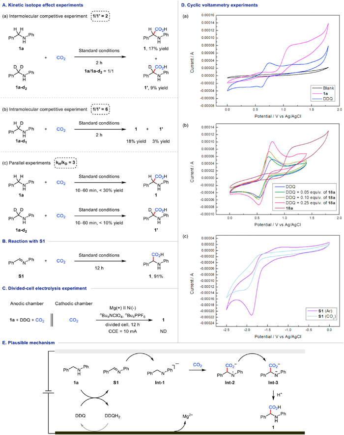 Several mechanistic experiments were carried out to gain insight into the reaction mechanism. Firstly, kinetic isotope effect experiments were conducted between benzylamine 1a and its deuterated derivative 1a-d2 or 1a-d1 (Fig. 4A). According to the intermolecular and intramolecular competitive experiments, the proportions of 1 and 1′ were 2 and 6, respectively. Besides, the ratio of kH/kD for the parallel KIE experiment was 3. The above results suggested that C—H bond cleavage may be involved in the rate-determining step of this carboxylation reaction. Then, to verify if S1 was the key intermediate in this electrocarboxylation reaction, benzylamines 1a was replaced with imine S1 to couple with CO2, and 91% yield of product 1 was obtained under the standard conditions, showing that amine might be oxidized to imine during the reaction (Fig. 4B). However, when the reaction was carried out in the absence of DDQ, the yield of the product showed significantly reduced, possibly due to incomplete conversion of S1. Moreover, the divided-cell electrolysis reaction displayed that it was a linear paired electrolysis system because when the starting material and DDQ were in the anodic chamber, no product could be detected neither in the anodic chamber nor the cathodic chamber (Fig. 4C). Finally, several CV studies were performed under CO2 atmosphere (Fig. 4D). The oxidation peak of 1a was +1.13 V vs. Ag/AgCl, which could be oxidized at the anode. DDQ displayed a reversible oxidation peak at +0.75 V vs. Ag/AgCl, demonstrating a more easily oxidizable ability than benzylamine. This was further supported by Fig. 4D, image b, when 18a was combined with DDQ, an increased oxidation current of DDQ was observed with the increased amount of 18a. Meanwhile, cyclic voltammetry experiments revealed that under an Ar atmosphere, the reduction potential of S1 was −2.06 V vs. Ag/AgCl. Notably, under a CO2 atmosphere, the reduction peak of S1 remained, indicating that the imine S1 was reduced preferentially over CO2.