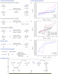 | Fig. 4. Mechanistic studies. (A) Kinetic isotope effect experiments. (B) Reaction with S1. (C) Divided-cell electrolysis experiment. (D) Cyclic voltammetry experiments. (E) Plausible mechanism. | |