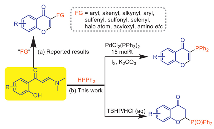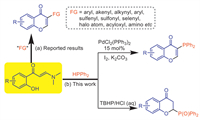 In conclusion, by making use of the in situ halogenation as the key tactic, we have designed and successfully achieved the first synthesis of 3-phosphinyl chromones involving the challenging C-P(Ⅲ) bond formation. In addition, to expande the diversity of functionalized chromone derivatives, we also have realized the selective synthesis of 2-phosphoryl chromanones by modifying the reaction conditions. The step economy of the C-P(Ⅲ) cross coupling without prior preparation of halogenated intermediate for the synthesis of phosphinyl chromones, as well as the metal-free selective synthesis of 2-phosphorylated chromanones provide practical accesses to divergent phosphorus functionalized chromones and chromanones.