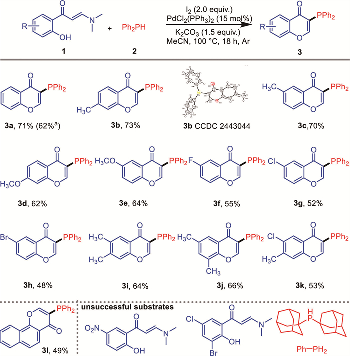 To start the work, the reaction of o-hydroxyphenyl enaminone 1a and diphenyl phosphine 2a was selected to probe applicable conditions. After systematic optimization on reaction parameters, including reaction medium, palladium catalyst species, base species, the loading of reagents, the reaction temperature, as well as reaction time, it was observed that running the reaction in MeCN in the presence of PdCl2(PPh3)2, molecular iodine, K2CO3 at 100 ℃ gave the target product 3-diphenylphosphinyl chromone 3a with optimal yield of 71% (Table S1 in the Supporting Information).