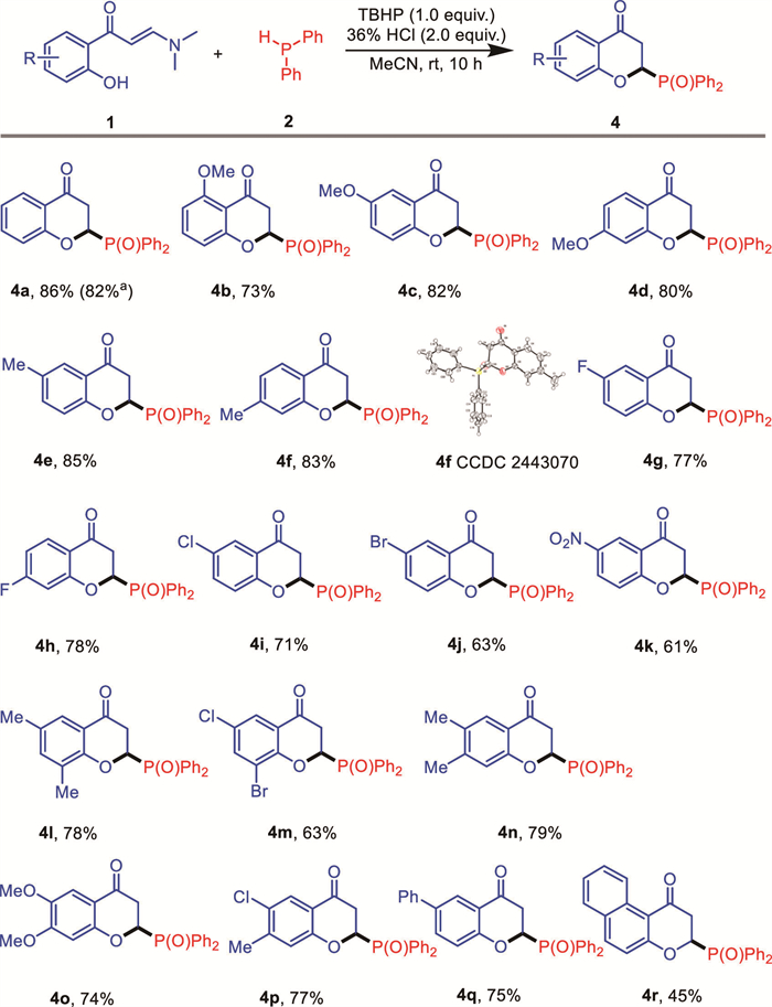After the synthesis of 3-phosphinyl chromones 3, further efforts in switching the reaction pathways with identical substrates were continuously executed. Interestingly, after extensive attempts in probing reaction conditions (Table S2 in Supporting information), we successfully achieved the selective synthesis of 2-phosphoryl chromanones by running the reaction at room temperature in the presence hydrochloric acid and TBHP. Under the mild and simple conditions, the chromonone products resulting from the novel selective transformations were acquired with generally good to excellent yields (Scheme 3). Besides the reaction with enaminone 1a, typical functional groups in the form of single (4b-4k, 4q) and dual substitution (4l-4p) in the phenyl ring of enaminone substrates were proven generally applicable for the synthesis. Further, the naphthyl derived o-hydroxyaryl enaminone reacted with 2 to provide product 4r with moderated yield (Scheme 3). It should be noted that the synthesis of such phosphoryl chromanones has not be previously accessed by the o-hydroxyaryl enaminone annulation reactions. Afterwards, the product 4a was employed with stoichiometric zinc powder in MeCN at room temperature, but no 2-phosphinyl chromone was observed. Further, the reaction using enaminone without hydroxyl group in the phenyl ring, the (E)-3-(dimethylamino)-1-phenylprop-2-en-1-one with 2 was performed under the standard conditions in Schemes 2 and 3, respectively. Neither the C—H phosphinylation, nor the phosphorylation of the enaminone was observed.