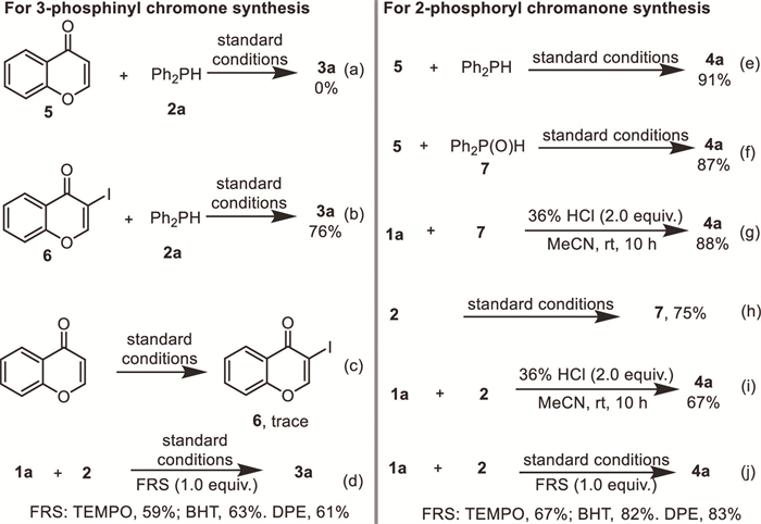 For the sake of investigating reaction mechanisms, a plethora of control experiments were designed and performed. For the reaction providing 3-phosphinyl chromone, employing the chromone 5 and diphenyl phosphine 2 to the standard reaction conditions did not provide 3a (Scheme 4a), confirming that the C—H bond in chromone was inactive for the phosphination. Analyzing the model reaction mixture at the stage of 2 h confirmed the formation of 3-iodochromone (see Supporting information for details). In addition, the reaction using 3-iodochromone 6 and 2 gave the product 3a with high yield (Scheme 4b), suggesting that 3-iodochromone was a key intermediate in the formation of 3. Further explore by subjecting chromone 5 alone to the standard conditions did not provide 6 (Scheme 4c), indicating that chromone 5 could not be the intermediate in the formation of 6. In addition, running the reaction in the presence of free radical scavenger (FRS), including TEMPO, BHT and DEP led to no evident inhibition to the synthesis of 3a (Scheme 4d). On the other hand, for the mechanism toward the selective synthesis of 2-phosphoryl chromanones 4, the reaction of 5 with 2 gave product 4a with excellent yield (Scheme 4e), and analogous results was observed by using diphenyl phosphine oxide 7 as alternative reaction partner (Scheme 4f), implying that the phosphine 2 might first undergo oxidation to generate phosphine oxide 7 to participate the 4a production. Indeed, the reaction of enaminone 1a with 7 could provide 4a with 88% yield in the absence of TBHP (Scheme 4g), further supporting this hypothesis. Employing diphenyl phosphine alone to the conditions led to the formation of diphenyl phosphine oxide 7 with 75% yield (Scheme 4h), and running the model reaction under air allowed the synthesis of product 4a with 67% yield (Scheme 4i). The results suggested that the diphenyl phosphine could be oxidized into corresponding phosphine oxide both by TBHP and air. Finally, the reaction under FRS was also run wherein no inhibition to the formation of 4a was observed, either (Scheme 4j).