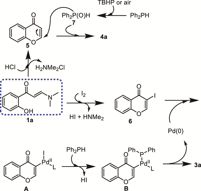 Following these information, the mechanisms for the two selective reactions are proposed (Scheme 5). For the formation of 3-phosphinyl chromones, enaminone 1a couples molecular iodine to provide 3-iodochromone 6 via chromone annulation and electrophilic iodination. In the presence of palladium catalyst, the in situ generated C(sp2)-I bond then undergoes oxidative addition to afford Pd(Ⅱ) inserted intermediated A. The substitution of diphenyl phosphine to the iodine anion leads to intermediate B. After that, a typical reductive elimination of B gave target product 3a and releases Pd(Ⅱ) for continuous catalysis. On the other hand, under the conditions with only hydrochloric acid and TBHP, the enaminone 1a proceeds to chromone 5 via typical acid promoted chromone annulation. Meanwhile, the oxidation of diphenyl phosphine 2 by TBHP or air gives diphenyl phosphine oxide 7. Subsequently, the typical nucleophilic addition of Ph2P(O)H to the polar enone fragment in chromone affords 2-phosphoryl chromonone 4a.