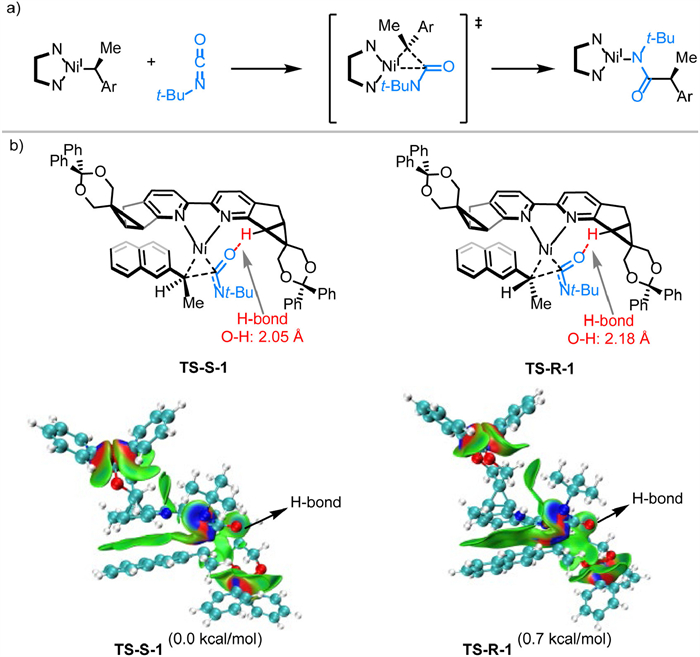 | Fig. 3. (a) The plausible transition state of enantio‑determining step. (b) IGMH analysis of the two energetically lowest conformations in the enantio‑determining step. | |