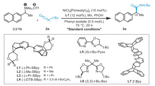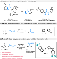 The groups of Martin and Komeyama, have independently developed innovative racemic reductive amidation reactions with isocyanates, using alkyl halides or tosylates as the substrates (Scheme 1b) [39-43]. The success of these reactions in terms of reactivity and regioselectivity is largely influenced by the choice of specific ligand architectures. Nonetheless, the limited availability of chiral ligands, especially 2,2′-bipyridine ligands, has posed a challenge in developing an enantioselective variant of the reductive coupling reaction that includes isocyanates.