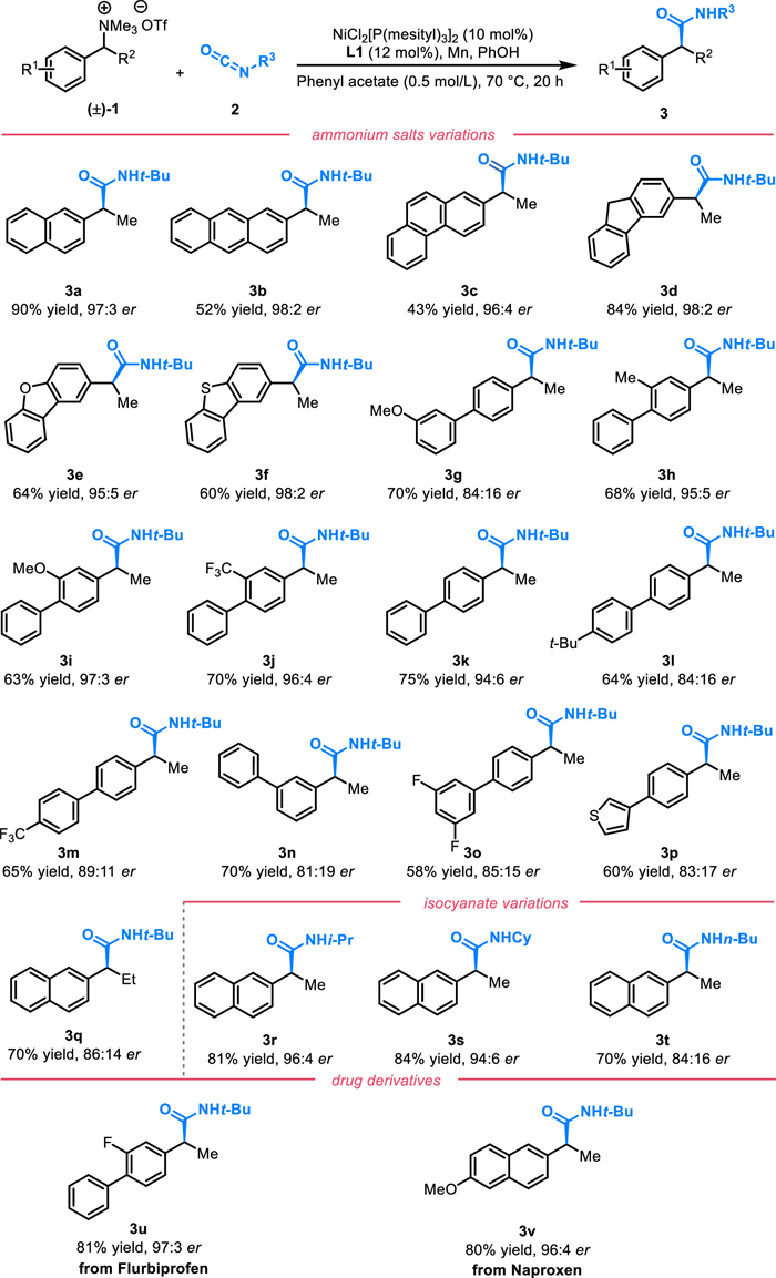 To begin our investigations, we chose trimethyl 1-(naphthalen-2-yl)ethyl ammonium trifluoromethanesulfonate (1a) and tert‑butyl isocyanate (2a) as the benchmark substrates to test our envisioned asymmetric reductive amidation. Pleasingly, after thorough experimentation, we established an optimal set of conditions. These involved using NiCl2[P(mesityl)3]2 as the precatalyst, Ph-SBpy (L1) as the chiral ligand, Mn as the reductant, PhOH as an additive, and phenyl acetate as the solvent at 70 ℃ for 20 h, yielding the target product 3a with 90% yield and 96:4 enantiomeric ratio (er) (Table 1, entry 1). As depicted in Table 1, alterations in the acetal substitution in SBpy markedly influence the reaction’s activity and stereoselectivity. For example, utilizing Me-SBpy (L2), the chiral amides were obtained with 81% yield and 93:7 er (Table 1, entry 2). Employing DTB-SBpy (L4), which offers greater steric hindrance, resulted in poor outcome of 51% yield and 72:28 er (Table 1, entry 4). Moreover, the use of the bulkier i-Pr-SBpy (L3) completely inhibited the reaction (Table 1, entry 3). Additionally, we evaluated the impact of several readily available dinitrogen chiral ligands, Pyox (L5) and BOX (L6), and found their incompatibility with this reaction (entries 5 and 6). Furthermore, the comparatively high rigidity of Z-bpy (L7) did not aid in the amidation reaction (Table 1, entry 7). Additionally, it is plausible that molecular interactions between the aryl group at the ligand’s distal end and the substrate could enhance the reaction. Subsequently, we discovered that the selection of the Ni catalyst played a crucial role in the reaction’s outcome. For instance, NiCl2 and Ni(PPh3)2Cl2 were less effective in terms of yield, though they did not significantly impact stereoselectivity (Table 1, entries 8 and 9). This might be because of the stability of the ligands on the nickel center can affect the rate of ligand exchange processes. More stable complexes might undergo slower ligand exchange, leading to more controlled reaction conditions and higher yields [48]. Moreover, polar solvents with good solubility, such as 2-MeTHF and ethyl formate, appeared to be suitable for the reaction but yielded slightly inferior results (Table 1, entries 10 and 11). Additionally, control experiments underscored the significance of strategies for regulating isocyanate activity. When the reaction was carried out without phenol, there was a significant increase in side reactions involving isocyanates, which led to a reduction in the yield of the desired product to 63%. However, adding phenol did not affect the enantioselectivity of the reaction, indicating that the presence of phenol helped to reduce unwanted byproducts without changing the preference for producing one enantiomer over the other (Table 1, entry 12). Furthermore, low temperatures were not favorable for the reaction to occur (Table 1, entry 13).