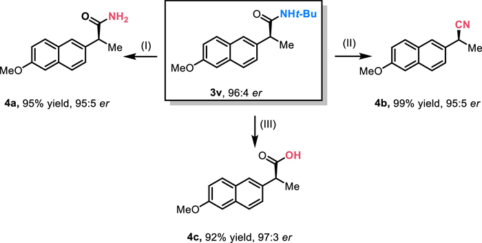| Scheme 3. Demonstrative transformations of α-chiral amide 3v, (Ⅰ) TfOH, toluene, (Ⅱ) Tf2O, 2-F-Py, DCM, (Ⅲ) LiOH, H2O2, THF/H2O. | |