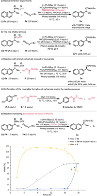 Preliminary mechanistic investigations were performed to elucidate the pathway of the nickel-catalyzed asymmetric reductive amidation of isocyanates with benzyl ammonium salts. First, radical-trapping experiments were performed by adding one equivalent of either 2,2,6,6-tetramethyl-1-piperidinyloxy (TEMPO) or diphenyl disulfide (PhSSPh) as a radical scavenger. The presence of these scavengers inhibited the amidation reaction, suggesting that benzyl radicals were generated during the reaction cycle, contributing to side reactions (Fig. 1a). Additionally, we found that the reaction outcome of triethylamine-derived quaternary ammonium salt was comparable to that of trimethylamine-derived one under the standard conditions, yielding the desired product 3a in 92% yield and 93% ee (Fig. 1b). The amidation reaction did not proceed when phenyl carbamate (5) was used instead of isocyanate (2a), demonstrating its inertness towards amidation. However, when additional triethylamine was added under identical conditions, the amidation product 3a was obtained in 60% yield and 94% ee (Fig. 1c). This result suggested that trialkylamines, particularly triethylamine, can regulate the release of isocyanates from phenyl carbamate under the reaction conditions. Reversibility of carbamate formation during reaction process was confirmed by the reaction involving phenylcarbamate and p-cresol in the presence of triethylamine. The presence of triethylamine likely facilitates the deprotonation of p-cresol, promoting the formation of the carbamate intermediate (Fig. 1d). NMR analysis confirmed the generation of both phenylcarbamate (5) and 4-methylphenylcarbamate (6) in the reaction mixture, with approximately 20% of the latter (see Supporting information for detail). To further confirm these hypotheses, the profiles of the key species over reaction time was monitored. The results indicated that under asymmetric amidation conditions, the release of trimethylamine from quaternary ammonium salts has a regulatory effect similar to that of triethylamine. In the early stages of the reaction, phenyl carbamate (5) was formed with isocyanates (2a) and phenol. After an induction period of approximately 12 h, during which the active nickel intermediate and trialkylamine gradually form, phenyl carbamate 5 begins to release isocyanate at 16 h and rapidly forms the chiral amide 3a, completing the reaction in 20 h. Based on this observation, we performed a reaction in the presence of triethylamine. As indicated in the graph, the reaction proceeds faster in the presence of triethylamine, which is likely due to the rapid release of isocyanate from carbamate, completing the reaction in 16 h (Fig. 1e).