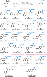 With the viable reaction conditions in hand, we explored the scope of the asymmetric amidation reaction, focusing initially on quaternary ammonium salts (Scheme 2). Delightfully, the reaction was amenable to a variety of quaternary ammonium salts with polycyclic arenes, including those with naphthalene, anthracene, and phenanthrene (3a-3d), as well as those with heterocyclic fused rings (3e, 3f), all of which were efficiently converted to products with good yields and high enantiomeric ratios. Additionally, quaternary ammonium salts with electron-donating and electron-withdrawing groups at the meta and/or para positions also participated in the asymmetric amidation reaction, yielding chiral amides in good yields (63%−70%) and enantiomeric ratios (84:16–97:3) (3g-3j). Biphenyl substrates, both unsubstituted (3k) and those with various electronic substituents like t‑butyl (3l) and trifluoromethyl (3m), were compatible with the reaction, albeit with moderate yields (64%−75%) and enantiomeric ratios (84:16–94:6). Notably, biphenyl substrates substituted at the meta position (3n) resulted in 70% and 81:19 er. Given the significance of fluorinated compounds in pharmaceuticals and agrochemicals, we tested ammonium salt with fluorine substitution. Encouragingly, biphenyl-containing difluoro benzene-substituted ammonium salt produced fluorinated chiral amide product (3o) with moderate yield and er. Furthermore, heterocyclic substrate i.e., 3-phenylthiophene (3p), resulted 60% yield and 83:17 er. Replacing the benzyl methyl ammonium salt with a benzyl ethyl ammonium salt resulted the product (3q) with 70% yield and 86:14 er. We then investigated the effect of isocyanates in this asymmetric amidation reaction. Interestingly, alkyl isocyanates, which were challenging to couple in previous studies, could be transformed into the desired amides (3r and 3s) in 81% and 84% yield and er 96:4 and 94:6, respectively. A lower er was observed for isocyanates with primary carbon center, such as n‑butyl isocyanate (3t), yielding chiral amides with 70% yield and 84:16 er. Ultimately, this reaction was also applicable for the synthesis of amide derivatives of two important drugs, flurbiprofen and naproxen. Under standard conditions, the flurbiprofen amide derivative (3u) was successfully prepared with 81% yield and 97:3 er, and the naproxen amide derivative (3v) was generated with 80% yield and 96:4 er. The absolute stereochemistry of (S)-2-([1,1′-biphenyl]−4-yl)-N-(tert‑butyl)propanamide (3k) was unambiguously confirmed to be the opposite configuration of the reported product, enabling the configuration assignment of all other products by analogy [49].