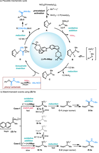 | Scheme 4. Proposed catalytic cycle of nickel-catalyzed asymmetric reductive amidation and explanation of match/mismatch events in case of chiral substrate. | |