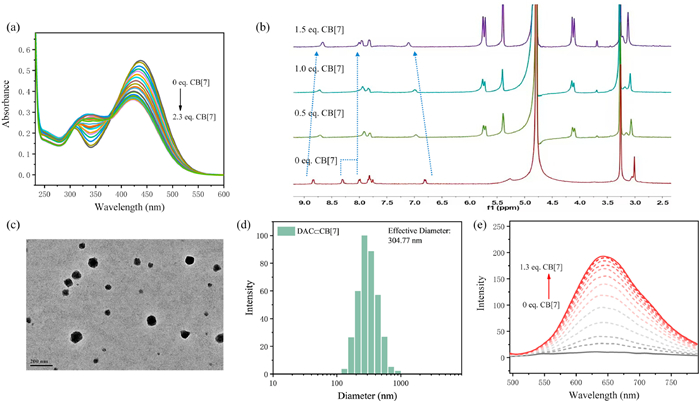 | Fig. 1. (a) UV–vis absorption spectra of DAC with the addition of CB[7] ([DAC] = 1.5 × 10–5 mol/L, [CB[7]] = 0–3.45 × 10–5 mol/L). (b) 1H NMR spectra of DAC with the addition of 0, 0.5, 1.0, 1.5 equiv. CB[7] (400 MHz, D2O/CD3OD = 8:2, 25 ℃, [DAC] = 1.0 × 10–3 mol/L, [CB[7]] = 0–1.5 × 10–3 mol/L). (c) TEM images of DAC⊂CB[7] ([DAC] = 2 × 10–5 mol/L, [CB[7]] = 2 × 10–5 mol/L). (d) DLS results of DAC⊂CB[7]. (e) Fluorescence spectra of DAC with the addition of CB[7] ([DAC] = 2.0 × 10–5 mol/L, [CB[7]] = 0–2.6 × 10–5 mol/L). | |