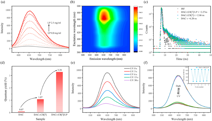 | Fig. 2. (a) Fluorescence spectra of DAC⊂CB[7] with the gradual addition of LP from 0–2.5 mg/mL ([DAC] = 2 × 10–5 mol/L, [CB[7]] = 2 × 10–5 mol/L). (b) Fluorescence excitation mapping of the DAC⊂CB[7]/LP. (c) Photoluminescence lifetime of DAC, DAC⊂CB[7], and DAC⊂CB[7]/LP, respectively with the instrument response function (IRF) ([DAC] = 2.0 × 10–5 mol/L, [CB[7]] = 2.0 × 10–5 mol/L, [LP] = 2.5 mg/ml). (d) The fluorescence quantum yields of DAC, DAC⊂CB[7], and DAC⊂CB[7]/LP ([DAC] = 2.0 × 10–6 mol/L, [CB[7]] = 2.0 × 10–6 mol/L, [LP] = 0.25 mg/mL). (e) Fluorescence spectra of DAC⊂CB[7]/LP upon UV irradiation in 30 s. (f) Fluorescence spectra of DAC⊂CB[7]/LP under alternating UV irradiation and darkness. Insert: the corresponding changes of fluorescence of DAC⊂CB[7]/LP at 660 nm ([DAC] = 2 × 10–5 mol/L, [CB[7]] = 2 × 10–5 mol/L, [LP] = 2.5 mg/mL). | |