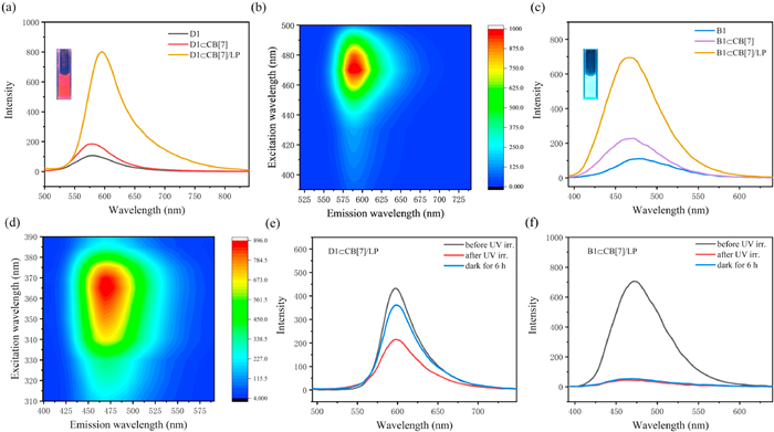 | Fig. 3. (a) Fluorescence spectra of D1, D1⊂CB[7] and D1⊂CB[7]/LP ([D1] = 2 × 10–5 mol/L, [CB[7]] = 2 × 10–5 mol/L, [LP] = 2.5 mg/mL). (b) Fluorescence excitation mapping of the D1⊂CB[7]/LP. (c) Fluorescence spectra of B1, B1⊂CB[7] and B1⊂CB[7]/LP ([B1] = 2 × 10–5 mol/L, [CB[7]] = 2 × 10–5 mol/L, [LP] = 2.5 mg/mL). (d) Fluorescence excitation mapping of the B1⊂CB[7]/LP. (e) Fluorescence spectra of D1⊂CB[7]/LP upon UV irradiation and in the dark ([D1] = 2 × 10–5 mol/L, [CB[7]] = 2 × 10–5 mol/L, [LP] = 2.5 mg/mL). (f) Fluorescence spectra of B1⊂CB[7]/LP upon UV irradiation and in the dark ([B1] = 2 × 10–5 mol/L, [CB[7]] = 2 × 10–5 mol/L, [LP] = 2.5 mg/mL). | |