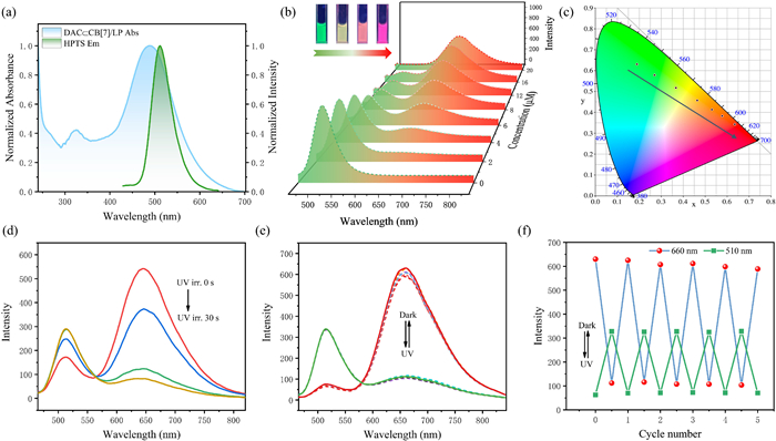 | Fig. 4. (a) UV–vis absorption spectra of DAC⊂CB[7]/LP and fluorescence spectra of HPTS ([DAC] = 2 × 10–5 mol/L, [CB[7]] = 2 × 10–5 mol/L, [LP] = 2.5 mg/mL, [HPTS] = 2 × 10–7 mol/L). (b) The fluorescence changes of HPTS upon gradual addition of the DAC in the presence of CB[7] and LP. Insert: photographs under a UV portable lamp of DAC⊂CB[7]/LP/HPTS complex ([DAC] = 0–2 × 10–5 mol/L, [CB[7]] = 2 × 10–5 mol/L, [LP] = 2.5 mg/mL, [HPTS] = 2 × 10–7 mol/L). (c) The 1931 CIE chromaticity diagrams of HPTS with the gradual addition of the DAC⊂CB[7]/LP. (d) Fluorescence spectra of DAC⊂CB[7]/LP/HPTS under UV irradiation in 30 s. (e) Fluorescence spectra of DAC⊂CB[7]/LP/HPTS under alternating UV irradiation and darkness. (f) Changes in the emission intensity at 660 nm and 510 nm according to (e) ([DAC] = 2 × 10–5 mol/L, [CB[7]] = 2 × 10–5 mol/L, [LP] = 2.5 mg/mL, [HPTS] = 2 × 10–7 mol/L). | |