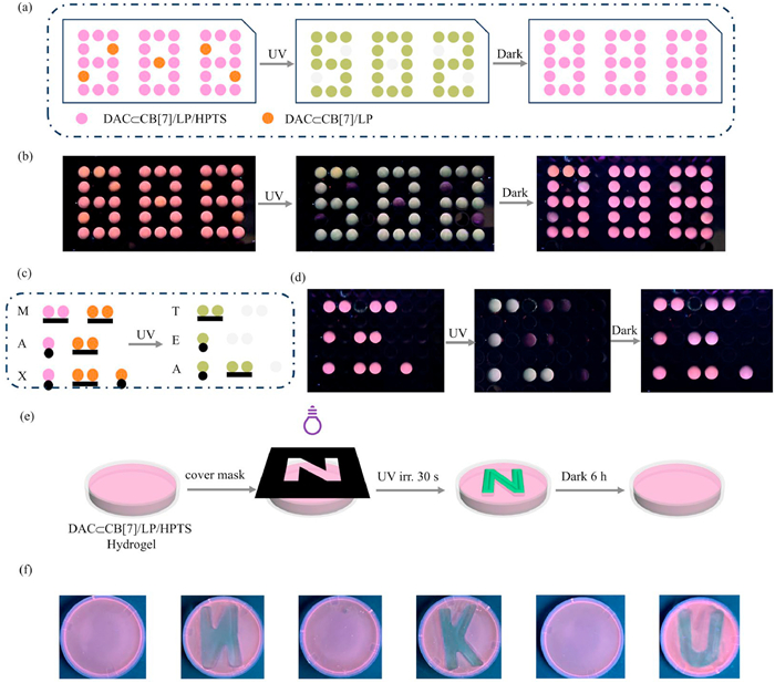 | Fig. 5. (a) Schematic diagram and (b) photographs of UV-induced display of encrypted numbers and darkness-induced information erasure based on supramolecular cascade assembly DAC⊂CB[7]/LP/HPTS and DAC⊂CB[7]/LP (DAC = 2 × 10–5 mol/L, CB[7] = 2 × 10–5 mol/L, LP = 2.5 mg/mL, HPTS = 2 × 10–7 mol/L). (c) Schematic illustration and (d) photographs of reversible changes of Morse code under alternating UV light irradiation and darkness based on supramolecular cascade assembly DAC⊂CB[7]/LP/HPTS and DAC⊂CB[7]/LP (DAC = 2 × 10–5 mol/L, CB[7] = 2 × 10–5 mol/L, LP = 2.5 mg/mL, HPTS = 2 × 10–7 mol/L). (e) Schematic diagram and (f) images under UV lamp of the construction of writable and self-erasing DAC⊂CB[7]/LP/HPTS supramolecular hydrogel (DAC = 2 × 10–5 mol/L, CB[7] = 2 × 10–5 mol/L, LP = 25 mg/mL, HPTS = 2 × 10–7 mol/L). | |