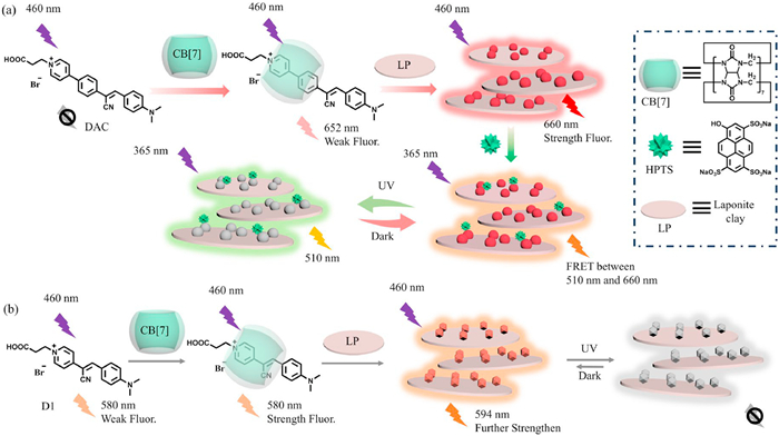 | Scheme 1. Schematic illustration and molecular structures of tunable luminescence supramolecular assembly (a) DAC⊂CB[7]/LP and (b) D1⊂CB[7]/LP. | |