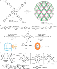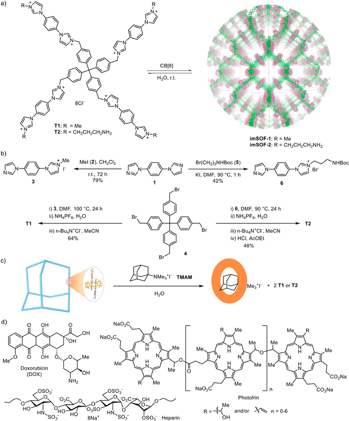 | Fig. 1. (a) Assembly of imSOF-1 and imSOF-2 from T1 or T2 and CB[8]. (b) Preparation of T1 and T2. (c) Substitution of TMAM for biimidazolium dimer in CB[8] leading to the decomposition of SOFs. (d) The structure of doxorubicin, photofrin, a heparin repeat unit. | |