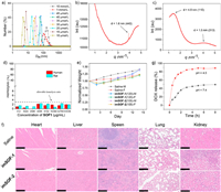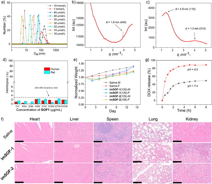 | Fig. 2. (a) DLS profile of imSOF-1 in water. (b) solid-state synchrotron SAXS profile of imSOF-1. (c) Solution-phase synchrotron SAXS profile of imSOF-1 ([T1] = 0.2 mol/L) in water. (d) Hemolytic activity of imSOF-1 with SD rat and human erythrocytes. Data are presented as mean ± SEM (n = 3). (e) Body weight of mice after intravenous injection of imSOF-1 and imSOF-2 of MTD (n = 6, 3 female + 3 male). (f) Representative pathological morphology of main organs of male mice harvested after euthanasia on day 14 after administration of saline, imSOF-1 (120 mg/kg) and imSOF-2 (105 mg/kg). Tissues were stained with hematoxylin and eosin and observed under a light microscope. (f) Representative pathological morphology of main organs harvested after euthanasia on day 14 after administration of saline (male) and imSOF-1 (120 mg/kg, male) and imSOF-2 (105 mg/kg, male). Tissues were stained with hematoxylin and eosin and observed under a light microscope (scale bar: 200 µm). (g) Dialysis profile for the release of DOX (0.1 mmol/L) from dialysis bag (1.5 mL, cutoff MW: 1000) to outside water (15 mL) at 37 ℃ against time in the presence and absence of imSOF-1 ([T1] = 0.1 mmol/L) in the bag. The solutions were prepared in PBS (pH 7.4) buffer and AcOH/AcONa buffer (pH 4.5). | |