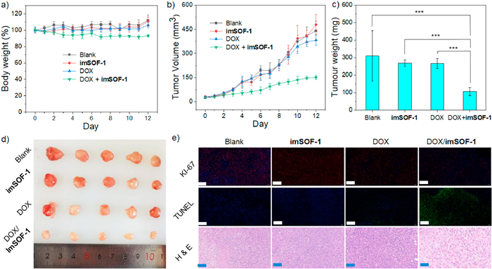 | Fig. 3. (a) Body weight of MDR A549/ADR tumor-implanted mice after treated with saline, imSOF-1, DOX and DOX/imSOF-1. (b) Tumor volume versus the day monitored. (c) Average excised tumor weight of each group. (d) Photographs of tumor tissues obtained on day 12 after the 1st administration (n = 5). (e) Micrographs of Ki-67, TUNEL and H & E-stained tumor tissues collected from each group (scale bar: 200 µm). | |