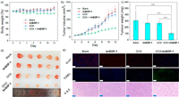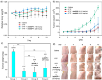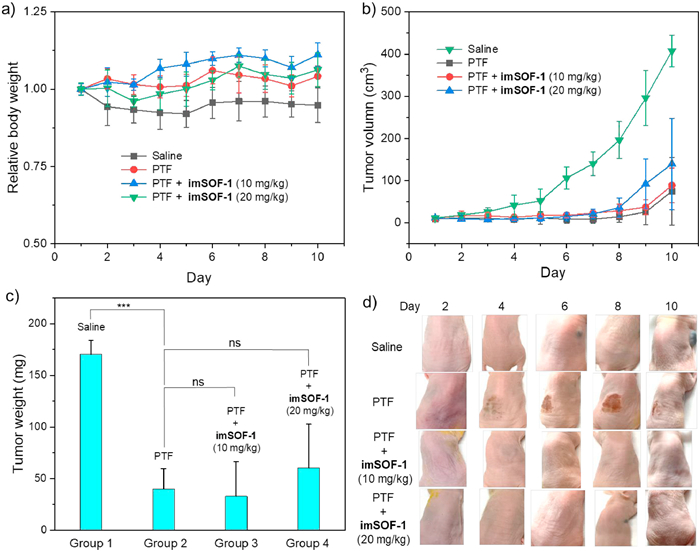 | Fig. 4. The effect of imSOF-1 on the photodynamic therapeutic activity and posttreatment phototoxicity of PTF in vivo. (a) Body weight of mice versus the day monitored. (b) Volume of tumors versus the day monitored. (c) Body weight of tumors harvested on the last day. (d) Images of the same mouse taken on different days after administration. | |