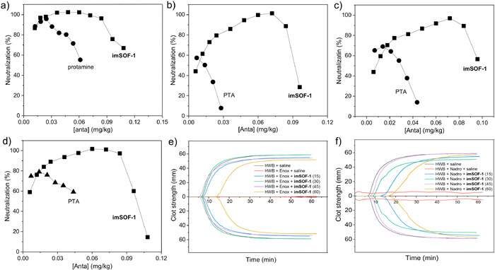 | Fig. 5. (a-d) APTT assays in bovine plasma for the neutralization of UFH, Enoxa, Nadro and Dalte (2.0 IU/mL) by incremental dose of imSOF-1 and PTA. (e, f) TEG assays for neutralization of Enoxa and Nadro (2.0 IU/mL) by imSO-F1 in HWB. | |
