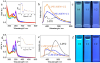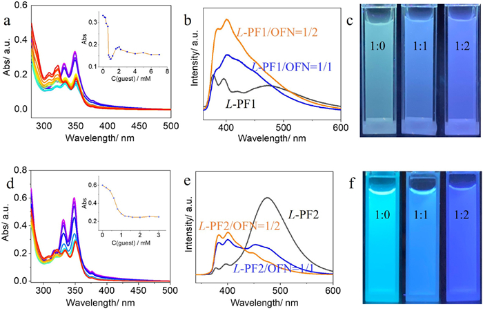 | Fig. 1. (a) UV spectra comparison of self-assembly and co-assembly of L-PF1 with OFN at different configurations. (b) Fluorescence spectra of L-PF1/OFN = 1/0~1/2. (c) Luminescence colors of L-PF1/OFN = 1/0~1/2 under a 365 nm light. (d) UV spectra comparison of self-assembly and co-assembly of L-PF2 with OFN at different configurations. (e) Fluorescence spectra of L-PF2/OFN = 1/0~1/2. (f) Luminescence colors of L-PF2/OFN = 1/0~1/2 under a 365 nm light. Concentrations of L-PF1/OFN and L-PF2/OFN were 0.01 and 0.05 mmol/L, respectively. | |