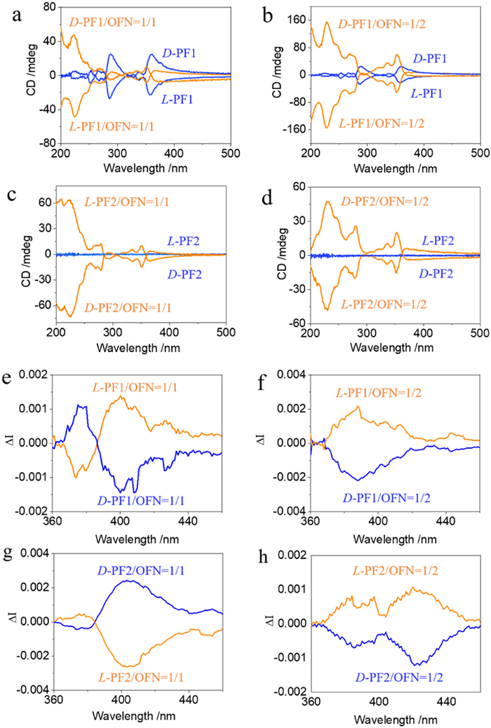 | Fig. 2. (a–d) CD spectra comparison of self-assembly and co-assembly of different configurations. CPL spectra comparison of assemblies: (e) L/D-PF1/OFN =1/1; (f) L/D-PF1/OFN = 1/2; (g) L/D-PF2/OFN = 1/1; (h) L/D-PF2/OFN = 1/2; λex = 340 nm and 320 nm, respectively. Concentrations of L/D-PF1 and L/D-PF2 were 0.5 mmol/L. | |