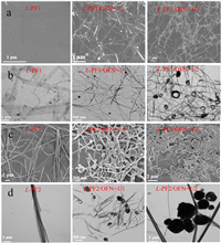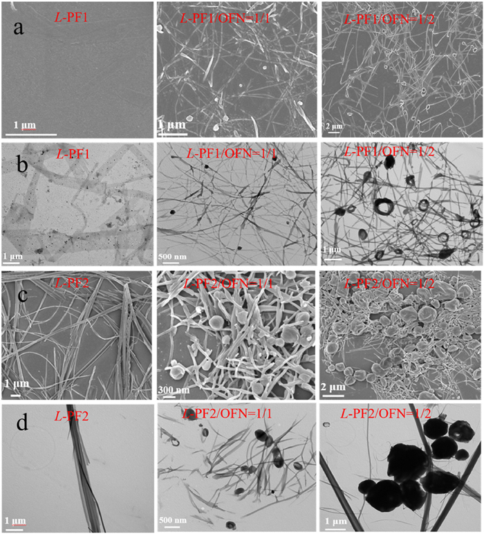 To reveal the morphology of the assemblies, the scanning electron microscopy (SEM) and transmission electron microscopy (TEM) were recorded (Fig. 3). Self-assembly of L-PF1 showed lamella structures while L-PF2 individually displayed fiber structures, indicating that minor structural difference of molecules led to great change of aggregate morphologies. After co-assembly with OFN, L-PF1/OFN exhibited spiral fibers when the molar ratio was 1:1 and it further evolved into a spiral coil at one top of the spiral fibers when the molar ratio arrived at 1:2. As for L-PF2, OFN participation produced spherical microparticles when the molar ratio was 1:1 and the number of spheroidal structures increased when the molar ratio reached 1:2. These results further demonstrated that minor structural changes of molecules could cause large changes in assembly.