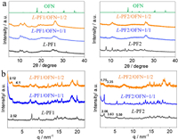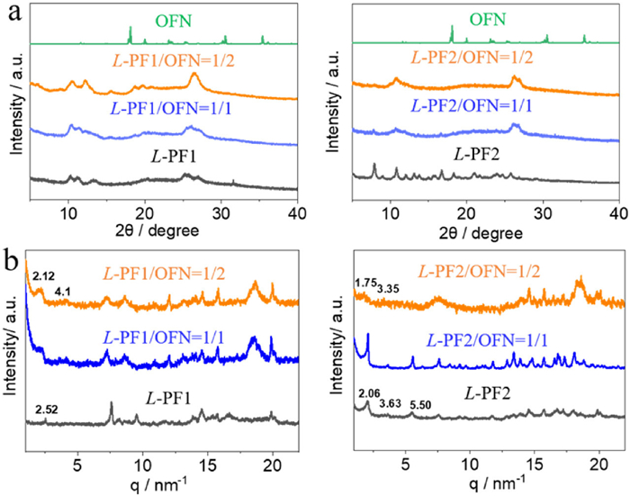 In order to describe the molecular assembly structures, X-ray powder diffraction (XRD) and small angle X-ray scattering (SAXS) were exploited to reveal the variations in molecular arrangement caused by the noncovalent bonds in different assemblies. XRD patterns comparison on the L-PF1 with OFN indicates the retainment of most diffraction patterns with however shifted bands. It suggests the partial social co-aggregation between the two components (Fig. 4a). And no individual diffraction peaks of OFN were found, which were assumably embedded in the molecular arrangement to afford new type of self-assembly arrays. Individual L-PF2 possesses several sharp peaks as the formation of well-ordered molecular packing, which however were replaced by the hump peaks after incorporating OFN, implying the extended one-dimensional aggregation with higher aspect ratios. SAXS patterns give information regarding the mesophase molecular stackings (Fig. 4b). The primary peak at 2.52 Å−1 transforms into new bands at 2.1 and 4.1 Å−1 respectively, which suggests the formation of lamellar phase with OFN. In case of L-PF2, the primary three bands at 2.06, 3.63 and 5.50 Å−1 correspond to the ratio of 1: √3: √7, corresponding to a well-defined hexagonal packing mode. After incorporating two molar equiv. OFN, the primary bands were replaced by a set of new bands at 1.75 and 3.35 Å−1 respectively, which is assigned as the lamellar structure. OFN with strong AP interaction induces the phase transformation.