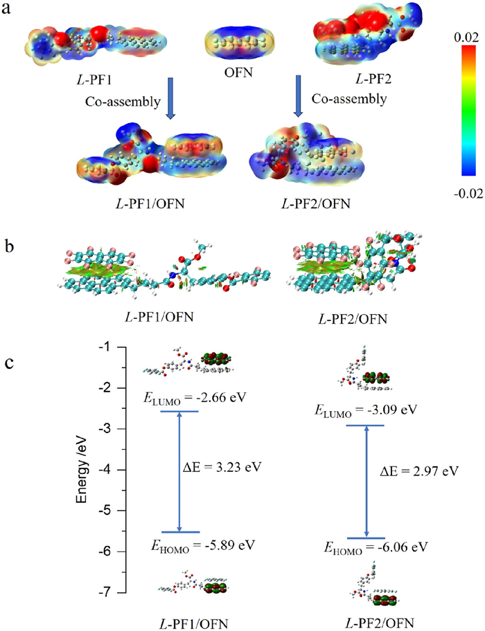 | Fig. 5. (a) Electrostatic potential maps of L-PF1/OFN and L-PF2/OFN. (b) Non-covalent interaction calculations of L-PF1/OFN and L-PF2/OFN. (c) Density functional theory calculations L-PF1/OFN and L-PF2/OFN. | |