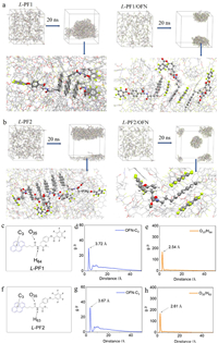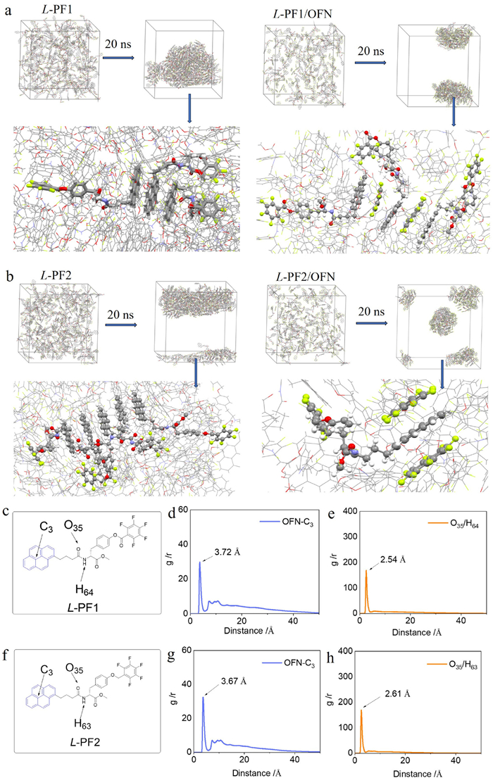 Molecular dynamic simulation (MD) was further employed to visualize the non-covalent bonds of self-assembly and co-assembly. 200 molecules of L-PF1 or L-PF2 were placed into a simulation box measuring 10 × 10 × 10 nm3. The system was allowed to equilibrate in water for a duration of 20 nanoseconds. And the co-assembly of L-PF1 or L-PF2 with OFN followed a similar procedure, employing a 1:1 molar ratio and utilizing a simulation box of dimensions 10×10×10 nm3 (Figs. 6a and b). The MD results demonstrated that self-assembled into aggregates via π-π stacking between pyrene planes and the introduce of OFN significantly changed the stacking between pyrene by AP interactions. Radial distribution function (RDF) maps were collected and the results were showed in Figs. 6d–h. Figs. 6d and g demonstrated the distances between pyrene of L-PF1/L-PF2 and OFN. The prominent peaks at 3.72 and 3.67 Å suggested a high likelihood of AP interaction occurring. The possibility of hydrogen bonds between O35 and H64 of L-PF1 (Fig. 6e) and hydrogen bonds between O35 and H63 of L-PF2 (Fig. 6h) were also calculated. The distance at 2.54 and 2.61 Å evidenced the presence of weak hydrogen bonds during the self-assembly and the co-assembly. These findings suggested that the introduction of OFN led to a notable reduction in π-stacking interactions among perylene moieties, implying that OFN intercalated within the arrangement of perylene moieties.