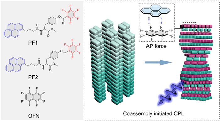 The combination of chiral molecules and achiral compounds in supramolecular co-assembly provides an effective method for creating chiral functional materials via non-covalent interactions like π–π stacking, hydrogen bonds, host–guest interactions, and electrostatic interactions among diverse building blocks [27-32]. Among them, the arene-perfluoroarene (AP) interaction represents a specific form of electrostatic interaction involving a perfluoroarene as the π acceptor and a non-fluorinated aromatic ring as the π donor [33-36]. The AP interaction has been regarded as a significant non-covalent force in the realms of supramolecular chemistry, crystal engineering, and materials science, which offers advantages for the regulation of optical and electronic properties of organic compounds [37-39]. Recently, octafluoronaphthalene (OFN) has been used as a molecular barrier to intercalate into matrices of organic aromatic fluorophores, with the goal of enhancing the emission efficiency of polycyclic aromatic hydrocarbons (PAHs) such as tetracene, perylene, pyrene, coronene, anthracene and phenazine [40-44]. For instance, our group designed and synthesized a series of pyrene-conjugated amino acids, pyrene-carboxylic acid-benzimidazole derivatives and perylene-conjugated peptoids. The results showed that these pyrene/perylene derivatives could form co-assemblies with OFN via AP interaction and induced the emergence of macroscopic chirality and CPL, which enriched the handedness of chiroptical active materials and functional chiral composites design [45-47]. Recently, two chiral molecules bearing pyrene and OFN though alanine were designed and synthesized by our group and their chiroptical properties upon self-assembly were studied. The results indicated that selective chiral dimerization and folding could achieve by intramolecular AP interactions, suggesting that chiral architectures at different hierarchical levels could be manipulated via AP interactions [48]. In this work, we designed and synthesized four molecules L/D-PF1 and L/D-PF2 with pyrene groups as π donor and pentafluorophenyl group as π acceptor. We envisioned that these compounds generated a chiral tweezer to include guests via intramolecular AP interactions. However, experimental and computational results indicated that these compounds did not form the desired chiral tweezers but self-assembled into some other superstructures like sheets or fibers via π–π stacking between pyrenes. This might due to the intermolecular AP interactions between pyrene groups and pentafluorophenyl group were weaker than the π–π stacking between pyrenes. To continue our work, OFN was introduced to co-assembly with the synthesized molecules. The results showed that co-assembly L/D-PF1 with OFN could form spiral fibers and amplified CPL. On the other hand, co-assembly L/D-PF2 with OFN could form chiral tweezers to include guest as OFN via intermolecular AP interactions. This difference might due to the fact that the rigid ester group fixed L/D-PF1 to a linear conformation while flexible ether allowed the L/D-PF2 molecules to fold into a tweezer structure. These results suggested that minor structural changes of molecules could cause large changes in assembly (Scheme 1).