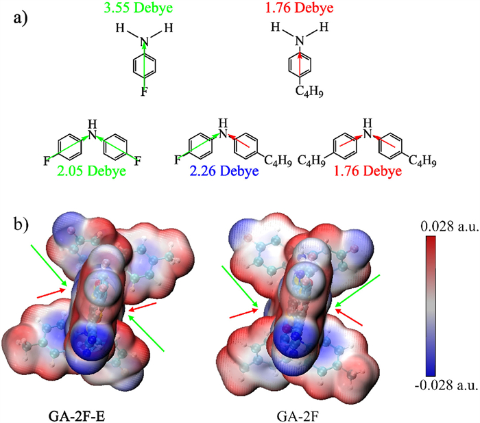| Fig. 1. (a) Molecular structures and dipole moments among 4-fluoroaniline, 4-butylaniline, bis(4-fluorophenyl) amine, 4–butyl–N-(4-fluorophenyl) aniline and bis(4-butylphenyl)amine. (b) ESP figures of GA-2F-E and GA-2F. | |