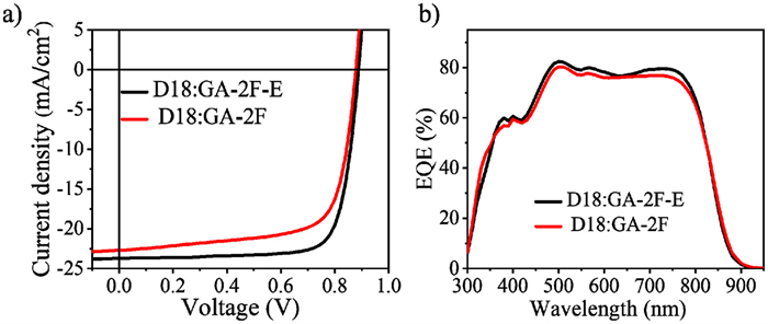 | Fig. 3. (a) J-V curves, (b) EQE curves of GA-2F-E and GA-2F-based OSCs. | |