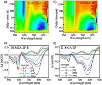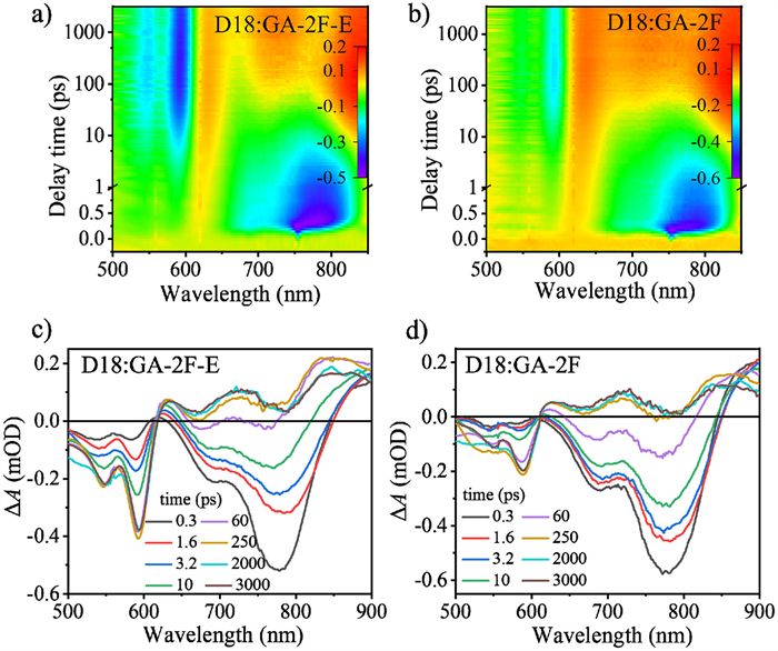 | Fig. 4. The TA color plot image and the corresponding TA spectra of (a, c) D18:GA-2F-E and (b, d) D18:GA-2F-based film with various decay times under 760 nm excitation. | |