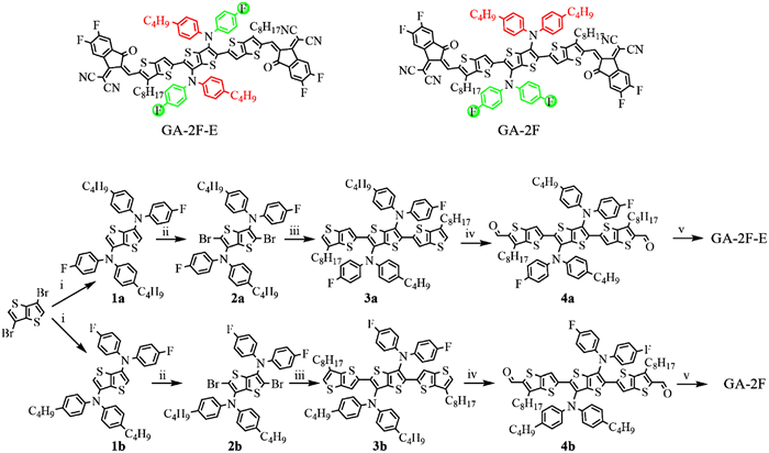 | Scheme 1. Chemical structures and synthetic routes of GA-2F-E and GA-2F. Reagents and conditions: (ⅰ) 4–Butyl–N-(4-fluorophenyl)aniline or bis(4-fluorophenyl)amine, bis(4-butylphenyl)amine, Pd(OAc)2, NaOt-Bu, P(t-Bu)3, o-xylene, 145 ℃; (ⅱ) NBS, DMF, 0 ℃; (ⅲ) trimethyl(6-octylthieno[3,2-b]thiophen-2-yl)stannane, Pd(PPh3)4, toluene, 110 ℃; (ⅳ) POCl3, 1,2-dichloroethane, DMF, 80 ℃; (ⅴ) 2-(5,6-difluoro-3-oxo-2,3-dihydro-1H-inden-1-ylidene)malononitrile, pyridine, CHCl3, r.t. | |