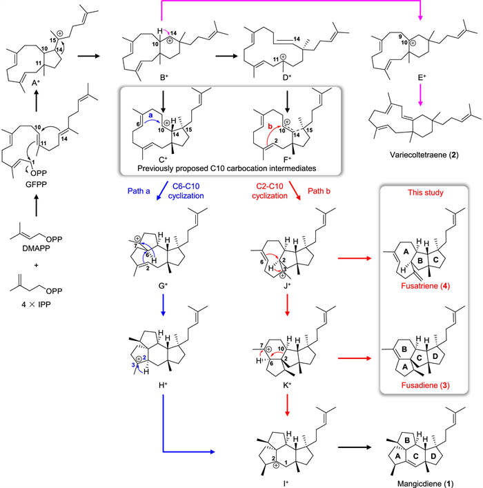 Regarding the formation of mangicdiene, it is well accepted that the cyclization begins with the departure of the pyrophosphate group of GFPP, followed by a concerted C1-C11/C10-C14 bicyclization to generate carbocation A+ (Fig. 1), which has been proposed to undergo a sequential 1,2-alkyl rearrangement to yield the C10 carbocation C+ via B+ [16]. However, the density functional theory (DFT) calculation revealed that A+ is likely to undergo two asynchronous events, including the 1,2-alkyl shift and C—C bond cleavage, to give D+ (Fig. 1), as the intermediate B+ is not a minimum on the potential energy surface [20]. This is in line with isolation of variecoltetraene, which is likely derived from E+ via B+. Subsequently, D+ is converted to the nonclassical C10 carbocation intermediate F+, wherein the single bond between C14 and C15, as well as the double bond between C10 and C14, is partially broken. After C10 carbocation formation, both C6-C10 cyclization (path a) and C2-C10 cyclization (path b) are able to lead to formation of mangicdiene (Fig. 1). The path a involves C6-C10 cyclization to G+, 1,2-hydride shift followed by C2-C6 cyclization to H+, 1,2-hydride shift to I+, and the final deprotonation of I+ (Fig. 1) [16]. Previously, the diterpene allokutznerene was also hypothesized to be formed in a similar manner [18]. In contrast, the path b seems a little prolix yet energetically reasonable, which requires C2-C10 cyclization to J+, 1,2-hydride shift followed by C2-C6 cyclization to K+, 1,2-hydride and alkyl shift to I+, and the final deprotonation of I+ (Fig. 1) [20]. Nevertheless, due to the lack of experimental evidence, it remains inconclusive whether mangicdiene is formed via the concise path a or the energetically favorable path b.