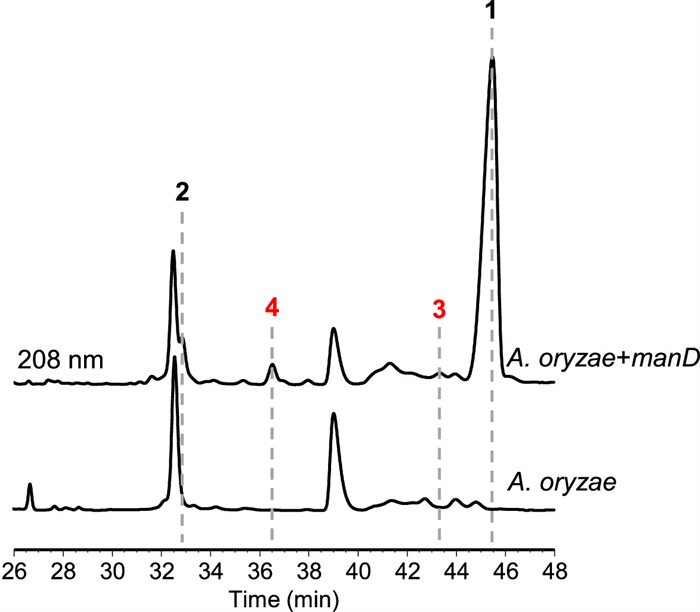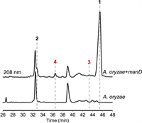 | Fig. 2. HPLC analysis of mycelial metabolites from the A. oryzae NSAR1 transformant harboring manD and the parent strain. | |