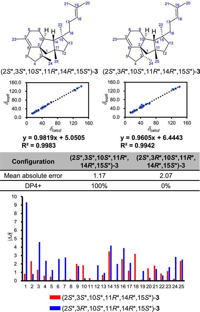 | Fig. 4. Comparison of the experimental 13C chemical shifts of 3 with calculated values of (2S*,3S*,10S*,11R*,14R*,15S*)−3 and (2S*,3R*,10S*,11R*,14R*,15S*)−3. | |