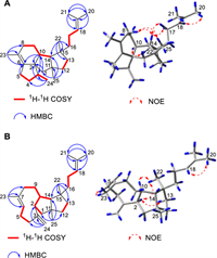 | Fig. 3. Key 1H−1H COSY, HMBC, and NOE correlations of 3 (A) and 4 (B). | |