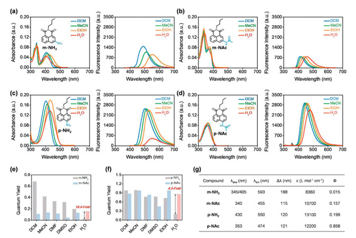 | Fig. 2. Photophysical properties of m-NH2, p-NH2, m-NAc and p-NAc. (a–d) Absorption and fluorescence spectra of four molecules (10 µmol/L) in various solvents. (e, f) Quantum yields of four molecules in various solvents. (g) Absorption (λabs) and emission maxima (λem), Stokes shifts (Δλ), molar extinction coefficient (ε) and QY (Ф) of four molecules measured in water. m-NH2: λex = 345 nm, m-NAc: λex = 340 nm, p-NH2: λex = 430 nm, p-NAc: λex = 353 nm, slit: 5/5 nm. | |