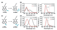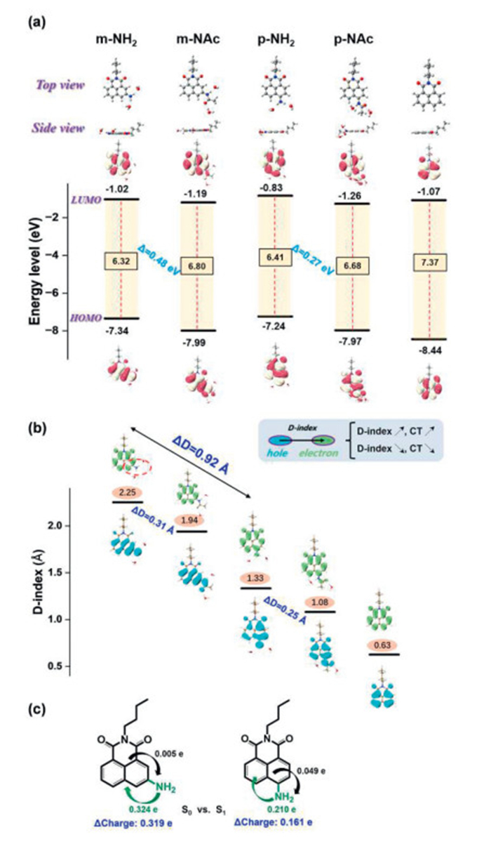 Herein, we synthesized m-NH2 and p-NH2 with a N-butyl moiety to simplify the molecule and avoid interference from photoinduced electron transfer (PeT) at the imide site and determined the photophysical properties of m-NH2, p-NH2, m-NAc and p-NAc (Figs. 1a and c). For p-NH2, only one absorption peak at around 430 nm appeared (Fig. 1d), but for m-NH2, two absorption peaks, one at around 405 nm, and the second at 345 nm was observed (Fig. 1b). The fluorescence spectra of m-NH2 exhibited a peak at 593 nm in water and displayed the largest blueshift (140 nm) after acetylation. Combined with theoretical calculation and experimental verification, the unique nature of meta-substituted m-NH2 vs. p-NH2 was revealed based on the calculated frontier molecular orbitals, parameters of electron-hole distance, and amount of internal charge transfer using quantum chemical calculations. The simulation results based on predicted total reorganization energy and molecular vibration modes which are used to verify the effect of -NH2 vibrations are in good agreement with the deuterium oxide and viscosity experiments. We believe this work can provide a deeper understanding of meta-amino substituted conjugated systems with ICT characteristics.