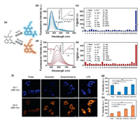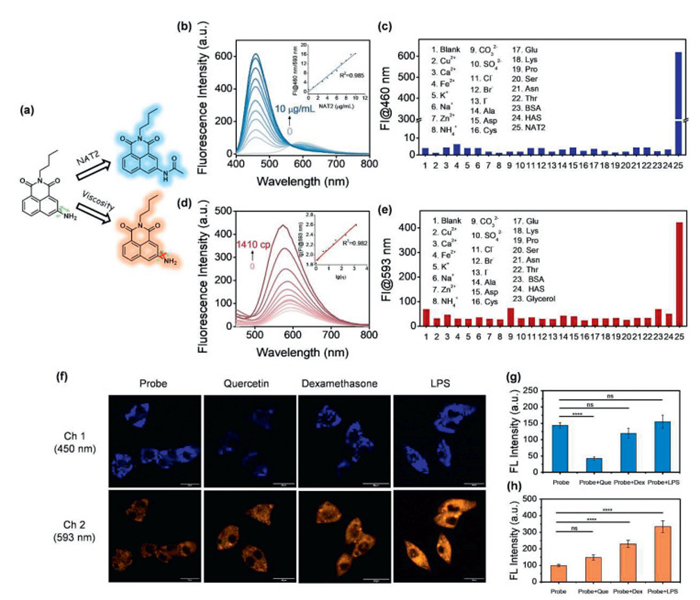 | Fig. 6. Spectral response of m-NH2 to NAT2 and viscosity. (a) Schematic illustration of simultaneous detection of NAT2 and viscosity changes by m-NH2. (b) Fluorescence spectra of m-NH2 (10 µmol/L) after incubation with different concentrations of NAT2 (0–10 µg/mL) at 37 ℃ in Tris–HCl buffer (50 mmol/L, pH 7.4, with 0.1% DMSO and 0.05 mmol/L acetyl-CoA). Insert picture: linear relationship between the ratio of fluorescence intensity at 460 nm to 593 nm and NAT2 concentration. (c) Fluorescence response of m-NH2 at 460 nm in the presence of different analytes. (d) Fluorescence spectra of m-NH2 (10 µmol/L) in glycerol/H2O mixtures with different viscosity. Insert picture: linear relationship between log (FI@593 nm) and log(η). (e) Fluorescence response of m-NH2 at 593 nm in the presence of different analytes. (f) Confocal fluorescence images of human hepatocellular carcinoma (HepG2) cells incubated with m-NH2 (10 µmol/L) only and treated with drugs (quercetin, dexamethasone and LPS). Fluorescence signals in the emission range (410–480 nm and 510–600 nm) were collected at excitation wavelengths of 405 nm (scale bar: 25 µm). (g, h) Relative fluorescence intensity of the corresponding two channels by different treatments. Data are presented as mean ± standard deviation (SD) (n = 3). ns, no significant difference. ****P < 0.0001. Student's t-test. | |