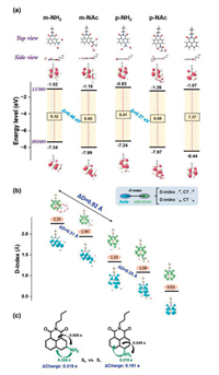 | Fig. 3. (a) Calculated HOMO and LUMO energy levels of five selected molecular dyes at the optimally-tuned-LC-BLYP*/6–311G+(d,p) level. (b) The analysis of electron-hole distribution of five molecules based on their lowest singlet excited state (S1), the D-index is defined as the distance (Å) between the centroids of the hole and electron distribution for the lowest singlet states. (c) The intramolecular charge transfer for two fragments between S0 and S1 states based on NPA. | |