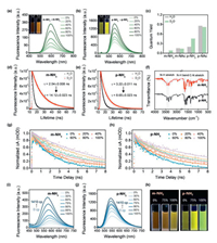 | Fig. 5. (a, b) Fluorescence spectra of m-NH2 (10 µmol/L) and p-NH2 (10 µmol/L) in mixtures of D2O/H2O. Insert picture: color photographs under 365 nm light in a dark room. (c) Quantum yields of four molecules in H2O and D2O. (d, e) Fluorescence lifetime decay curves of m-NH2 (10 µmol/L) and p-NH2 (10 µmol/L) in H2O and D2O. (f) FT-IR spectra of m-NH2 and p-NH2. (g) Kinetic decay of m-NH2 at 425 nm in mixtures of D2O/H2O (0%, 20%, 40%, 60%, 80%, 100% D2O) (λpump = 400 nm). (h) Kinetic decay of p-NH2 at 385 nm in mixtures of D2O/H2O (0%, 20%, 40%, 60%, 80%, 100% D2O). (λpump = 430 nm). (i, j) Fluorescence spectra of m-NH2 (10 µmol/L) and p-NH2 (10 µmol/L) in a mixture of glycerol/H2O with varying viscosity (0%, 30% wt, 60% wt, 75% wt, 90% wt, 95% wt, 100% glycerol). (k) Photographs of m-NH2 and p-NH2 in pure glycerol, the mixture of glycerol/H2O (v/v = 75:25) and in pure water under 365 nm light irradiation condition (m-NH2: λex = 345 nm, m-NAc: λex = 340 nm, p-NH2: λex = 430 nm, p-NAc: λex = 353 nm, slit: 5/5 nm). | |