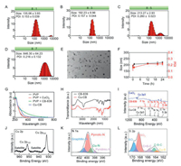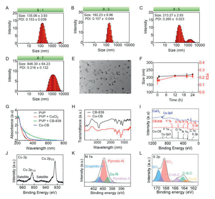 | Fig. 1. Preparation and characterization of Cu-CB. The size distribution of different formulations prepared by the feeding ratio of (A) 8:1, (B) 8:3, (C) 8:5, (D) 8:7. (E) The TEM image of Cu-CB. Scale bar: 200 nm. (F) The stability of Cu-CB. (G) UV–vis spectra of various agents. (H) FTIR spectra of CB-839 and Cu-CB. (I) XPS analysis of Cu-CB. XPS spectra of (J) Cu 2p, (K) N 1s and (L) S 2p. | |