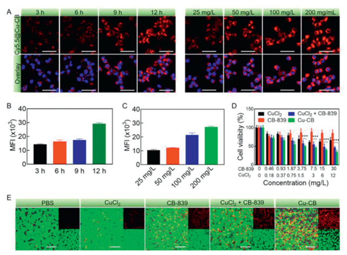 | Fig. 2. Antitumor study of Cu-CB in vitro. (A) CLSM images of 4T1 cells to observe the incubation time and drug dose dependent cellular uptake behavior after treatment with Cy5.5@Cu-CB. Scale bar: 50 µm. (B) Fluorescence quantitative analysis of 4T1 cells following treatment with Cu-CB for different time points (n = 3). (C) Fluorescence quantitative analysis of 4T1 cells following treatment with various concentrations of Cu-CB (n = 3). (D) Cell viability of 4T1 cells treated with different concentrations of drugs (n = 5). (E) Live/dead cell staining of 4T1 cells after treatment with PBS, CuCl2, CB-839, CuCl2 + CB-839 or Cu-CB. Scale bar: 200 µm. ***P < 0.001. The numerical results were presented as means ± standard deviation (SD). | |