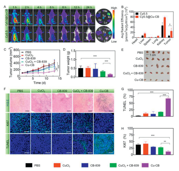 | Fig. 4. Antitumor study of Cu-CB in vivo. (A) The biodistribution of Cy5.5@Cu-CB and Cy5.5 in 4T1 tumor-bearing mice. (B) Quantitative fluorescence analysis of Cy5.5 and Cy5.5@Cu-CB in major organs (n = 3). (C) The tumor volumes, (D) weights and (E) image of 4T1 tumor-bearing mice after treatment with PBS, CuCl2, CB-839, CuCl2 + CB-839 or Cu-CB (n = 5). (F) H&E, TUNEL and Ki67 staining of tumor tissues after different drug treatments. Scale bar: 100 µm. The positive rate of (G) TUNEL and (H) Ki67 in tumor tissues. *P < 0.05, **P < 0.01, ***P < 0.001. The numerical results were presented as means ± SD. | |