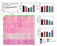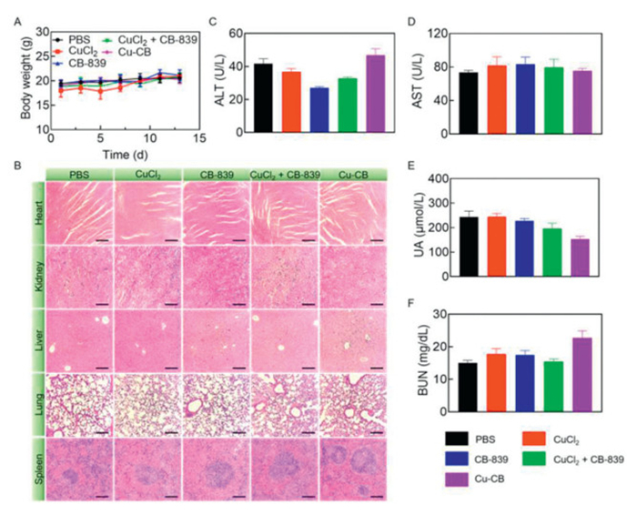 | Fig. 5. Biosafety analysis of Cu-CB. (A) The body weights of 4T1 tumor-bearing mice after treatment with PBS, CuCl2, CB-839, CuCl2 + CB-839 or Cu-CB (n = 5). (B) H&E staining of heart, liver, spleen, lung and kidney. Scale bar: 200 µm. (C) ALT, (D) AST, (E) UA and (F) BUN serum levels from biochemical tests of 4T1 tumor-bearing mice after treatment with PBS, CuCl2, CB-839, CuCl2 + CB-839 or Cu-CB (n = 3). The numerical results were presented as means ± SD. | |