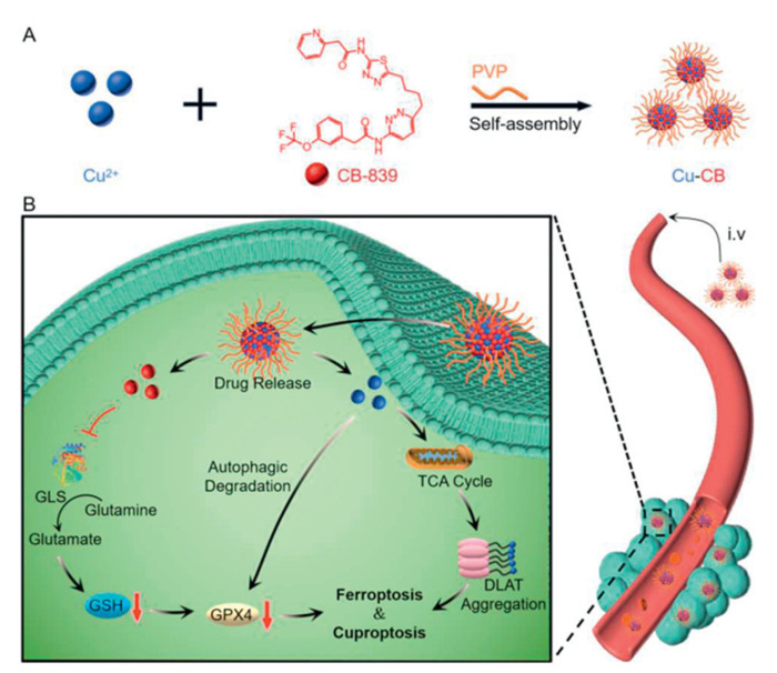 | Scheme 1. Schematic illustration of Cu-CB to trigger cuproptosis and cell ferroptosis for synergistic breast cancer suppression. (A) Cu-CB was prepared by the coordination effect between Cu2+ and CB-839 with the assistance of PVP. (B) Proposed mechanism of Cu-CB for tumor eradication. Cu-CB could passively target the tumor tissue after intravenous injection. Upon internalization by breast cancer cells, Cu-CB inhibited GSH synthesis and downregulated GPX4, triggering ferroptosis. Simultaneously, reduced GSH further promoted Cu2+ to induce DLAT aggregation and proteotoxic stress, initiating cuproptosis. This dual mechanism enabled Cu-CB to effectively induce both cuproptosis and ferroptosis, achieving synergistic therapy of breast cancer. | |
